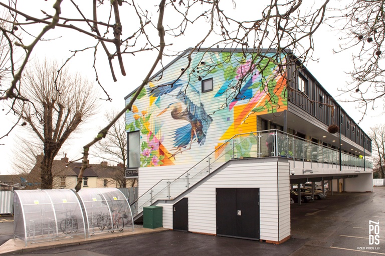 ZED PODS was chosen by Bristol City Council as the only provider which could deliver energy- efficient units and help them create a sustainable development in an affordable way. To demonstrate confidence in its own product and design, ZED PODS undertook the planning process at its own risk and incurred all the costs for external consultants and time for its in-house design team. The success of the Hope Rise project also depended on engagement from the community and key stakeholders. So the newly formed collaboration of Bristol City Council, Bristol YMCA and ZED PODS used the Bristol Housing Festival to allow potential residents and members of the community to experience a full-size demo unit. The consultation helped to remove many myths about the quality of MMC and any local concerns resident had, such as the loss of parking spaces. The consultation process also resulted in a local street artist winning a competition to draw a mural at one of the gable ends of the development.